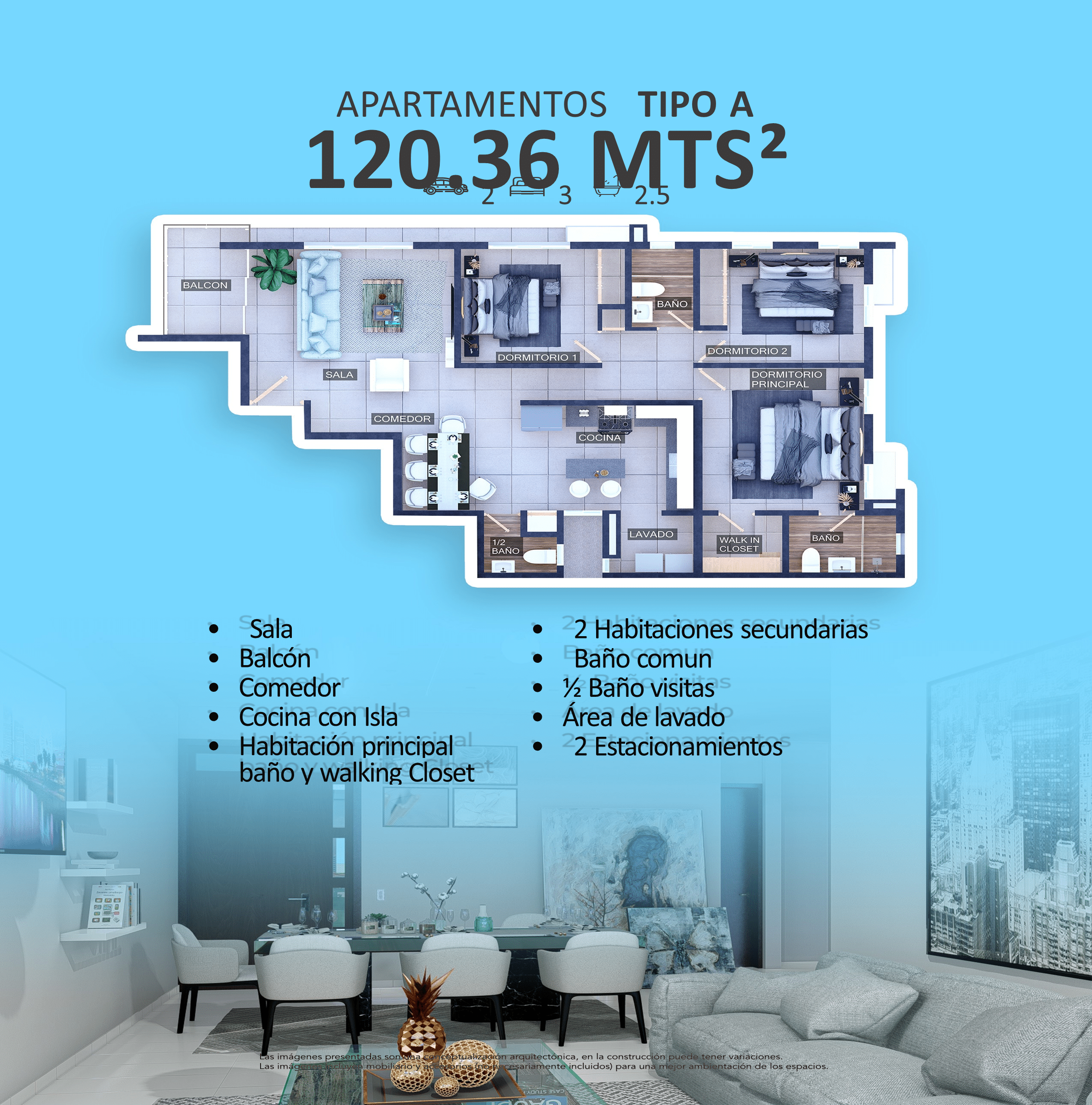 Características -2 y 3 Habitaciones -2 Baños – Medio baño para las visitas -Sala -Balcón comedor -Cocina con isla -Área de lavado -2 estacionamiento